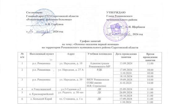 График занятий на тему: «Основы оказания первой помощи» на территории Романовского муниципального района Саратовской области.