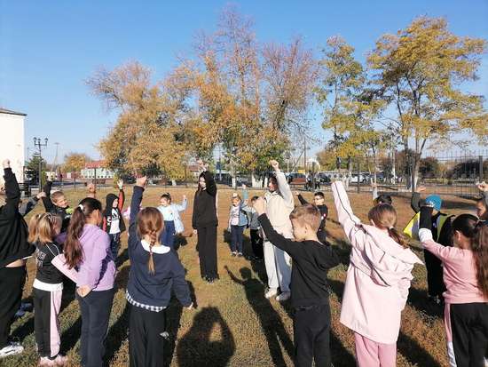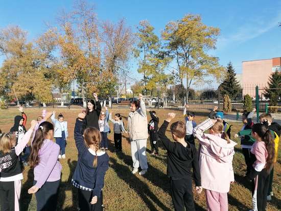 Обучающиеся 10-11 классов, выполняющие роль учителей физической культуры провели с ребятами зарядку и поиграли в подвижные игры на свежем воздухе.
