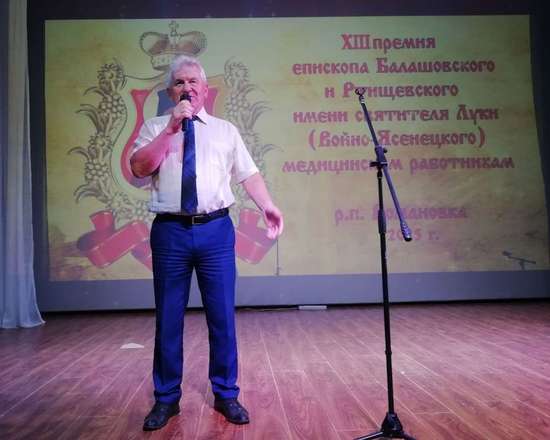 На мероприятии в районном Доме культуры глава района поприветствовал гостей, организаторов и участников на ежегодном празднике «ЗЕМСКИЙ ДОКТОР», который посвящен вручению премии во имя Святителя Луки лучшим работникам здравоохранения Прихоперья. Алексей Иванович отметил, что мы горды тем, что на Романовской земле жил и работал выдающийся врач и церковный деятель Святитель Лука (В.Ф.Войно-Ясенецкий). «ЗЕМСКИЙ ДОКТОР» - это уникальный культурный проект, мы и впредь будем содействовать в организации таких мероприятий.