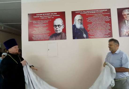 19 июня в здании поликлиники ГУЗ «Романовская РБ» состоялось торжественное открытие памятных стендов в честь Святителя Луки Симферопольского и Крымского (В.Ф. Войно-Ясенецкого) и главного врача Касьяна Петровича Маслова.