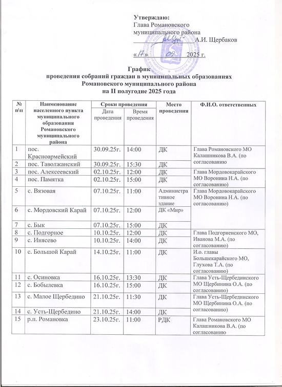График проведения собраний граждан в муниципальных образованиях Романовского муниципального района на II полугодие 2025 года