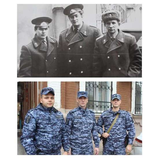 Среди множества работ особое место заняли кадры, разделенные десятилетиями, где запечатлены одни и те же люди — на архивных фото еще молодые бойцы, а сегодня ветераны и действующие сотрудники, продолжающие нести службу.