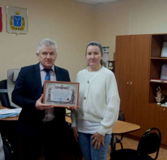 - координатор волонтерской группы «Своих не бросаем. Романовка» Евгения Панфилова от лица командования и личного состава воинской части, вручила главе района Благодарственное Письмо за активную деятельность, направленную на благо Вооруженных Сил РФ и за оказание благотворительной помощи военнослужащим.
