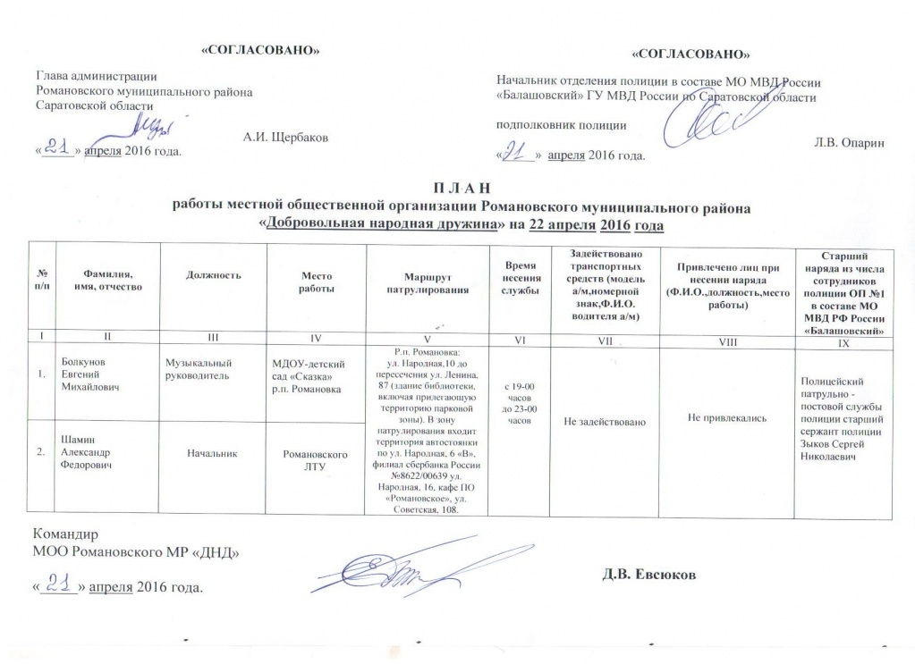 План работы местной общественной организации Романовского муниципального района "Добровольная народная дружина" на 22.04.2016 года